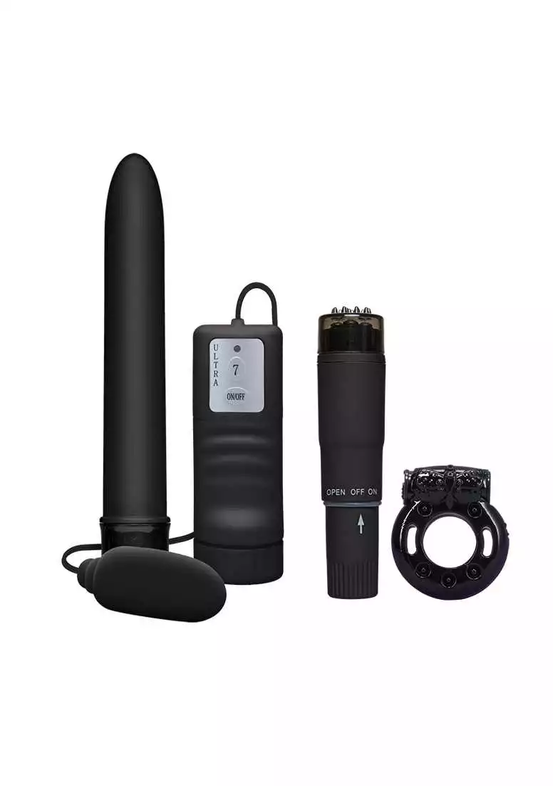 Stay up all night playing with these vibrators! This Black Magic Pleasure Kit includes the best-selling 7-inch Velvet-Touch Vibe, the Original Pocket Rocket, the Black Magic Bullet Vibe, and a Vibrating C-Ring, to satisfy all of your naughty cravings.
