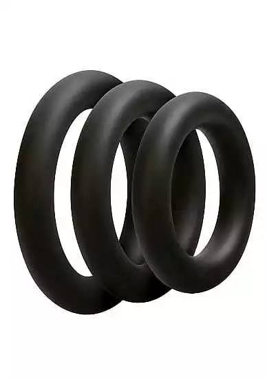 Optimize your experience with these silicone cock rings! The OptiMALE Thick C-Ring Set offers enhanced size and girth with three rings in 40mm 45mm and 50mm diameters. These rings are ultra-stretchable for easy use around the shaft or testicles maintaining those long-lasting erections youve always dreamed of and prolonging your ejaculation. Available in Black and Slate phthalate-free silicone.