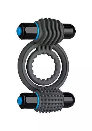 Packed with intense pleasure for both you and your partner the Vibrating Double C-Ring has two stretchable silicone rings ?for your shaft and testicles – helping you achieve and maintain long-lasting erections and prolonged ejaculation. For doubly powerful stimulation the dual bullets in textured sleeves target multiple erogenous zones: clitoris anus and testicles. The waterproof push-button bullets boast 10 unique functions and are removable for extended playtime. Available in Black and Slate phthalate-free batteries included.