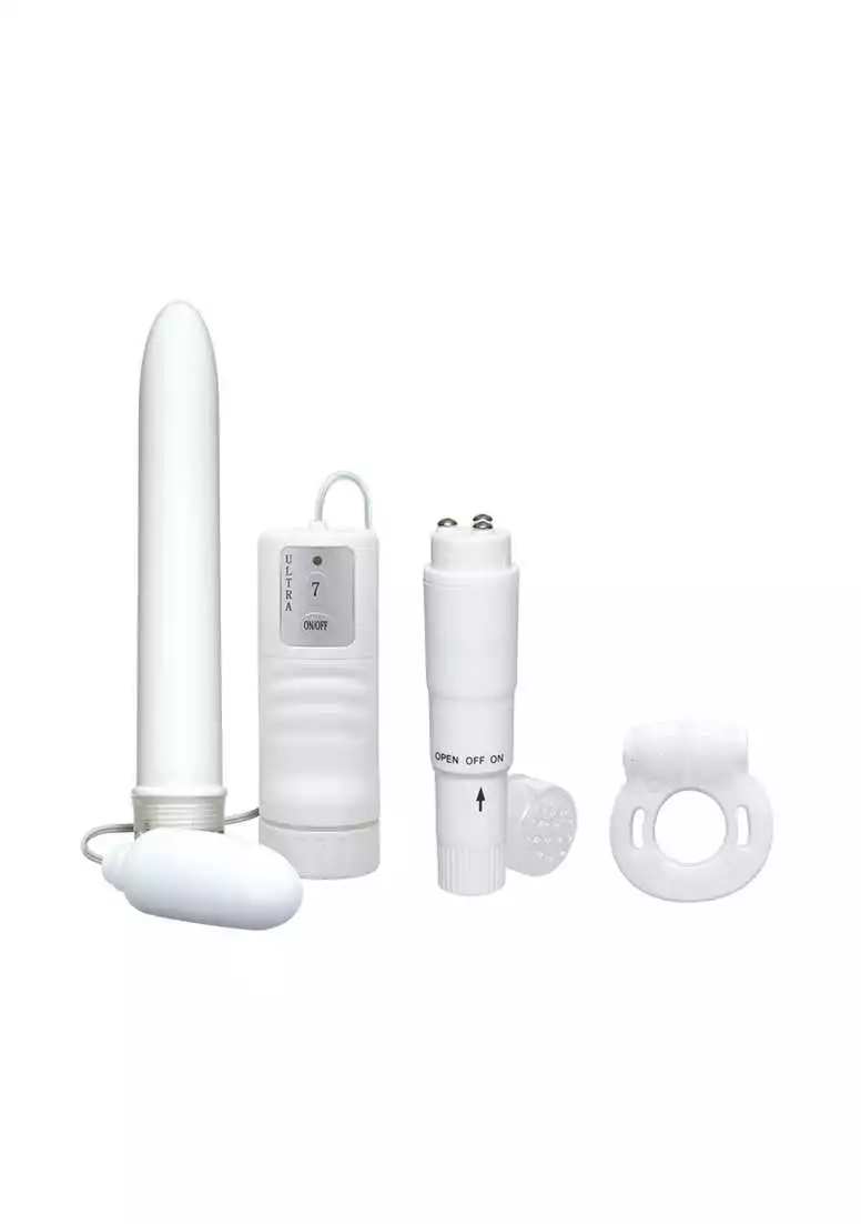 Stay up all night playing with these vibrators! This White Nights Pleasure Kit includes the best-selling 7-inch Velvet-Touch Vibe, the Original Pocket Rocket, the White Nights Bullet Vibe, and a Vibrating C-Ring, to satisfy all of your naughty cravings.